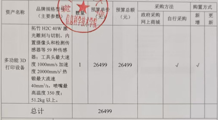 海南师范大学人工智能学院何书前老师按项目研究需要制作研制设备的外盒和封装外盒的需求而购置多功能3D打印机。经费来源:国家自然科学基金。